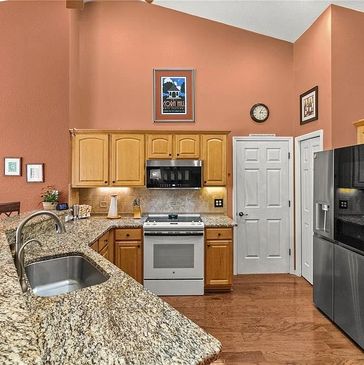 Our home has granite countertops, all new appliances including a stainless steel refrigerator and microwave oven.